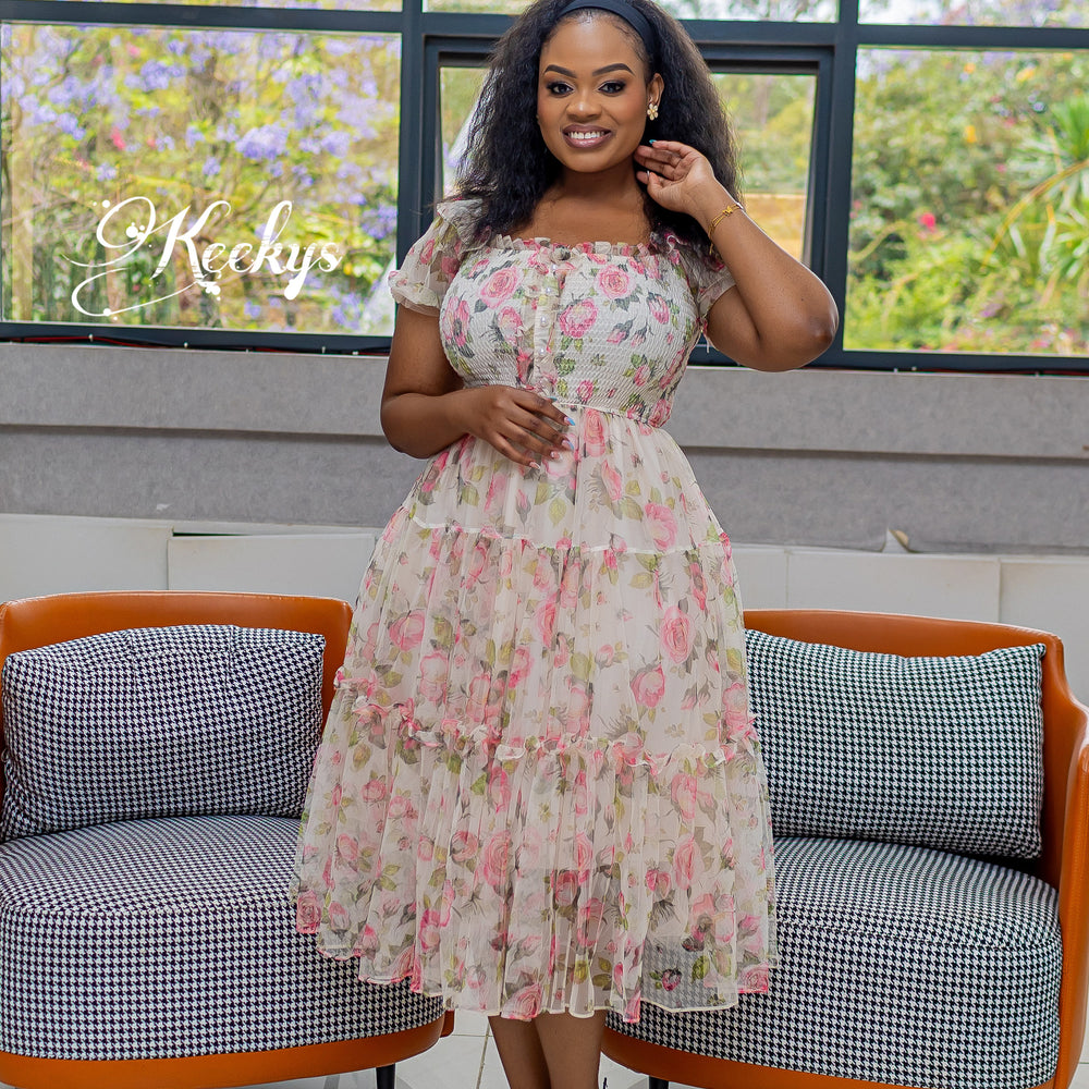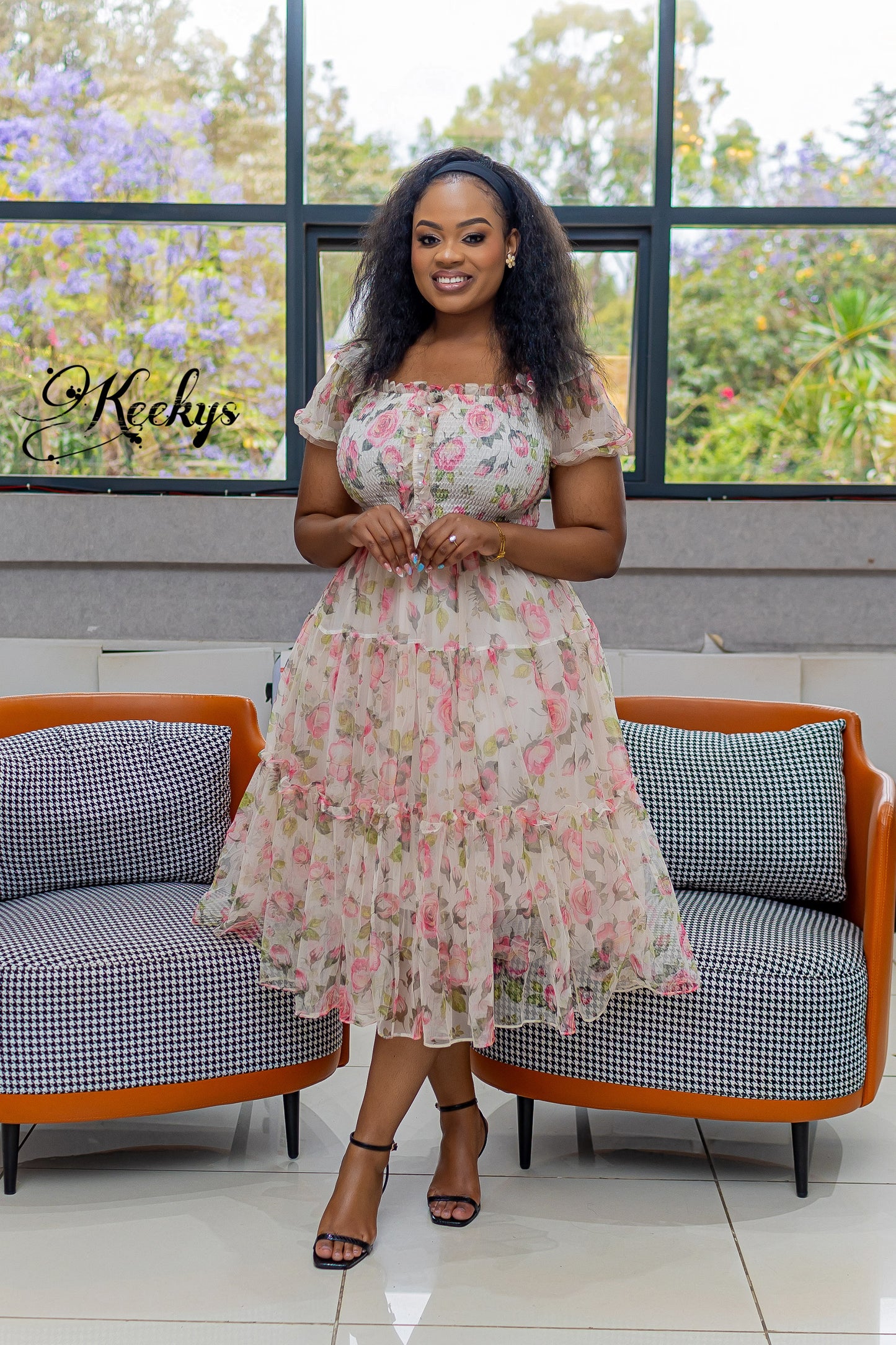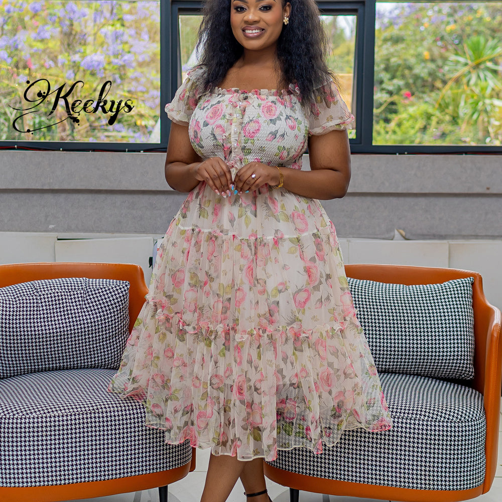 Features a square neckline with frilled sleeves that can be worn on or off the shoulder.
