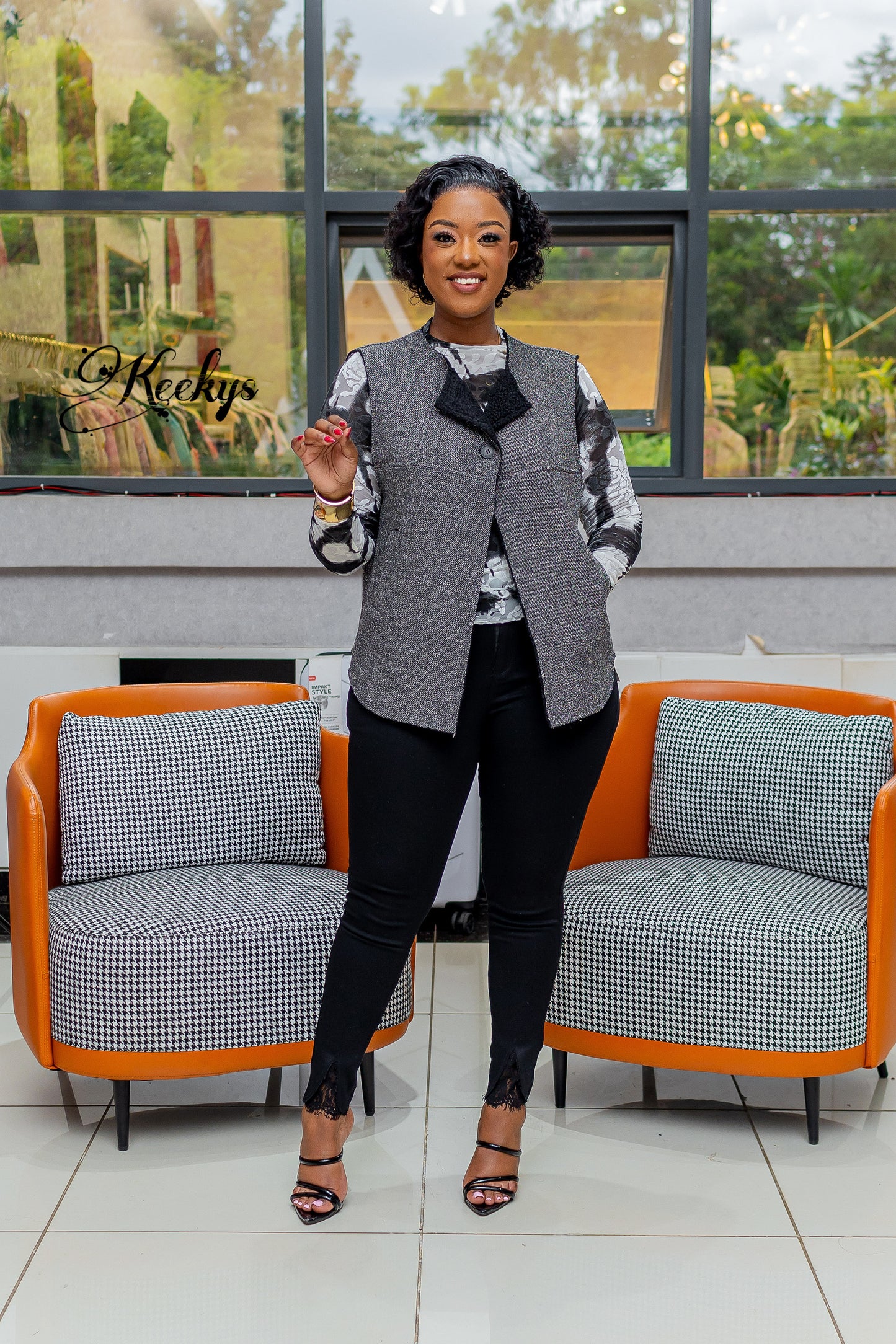Fashionable half jacket with illusion side pockets.