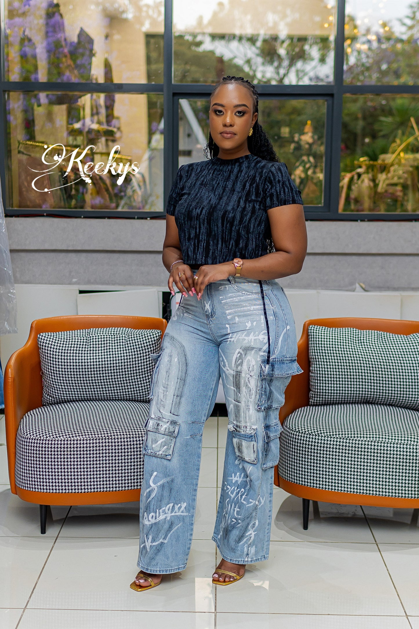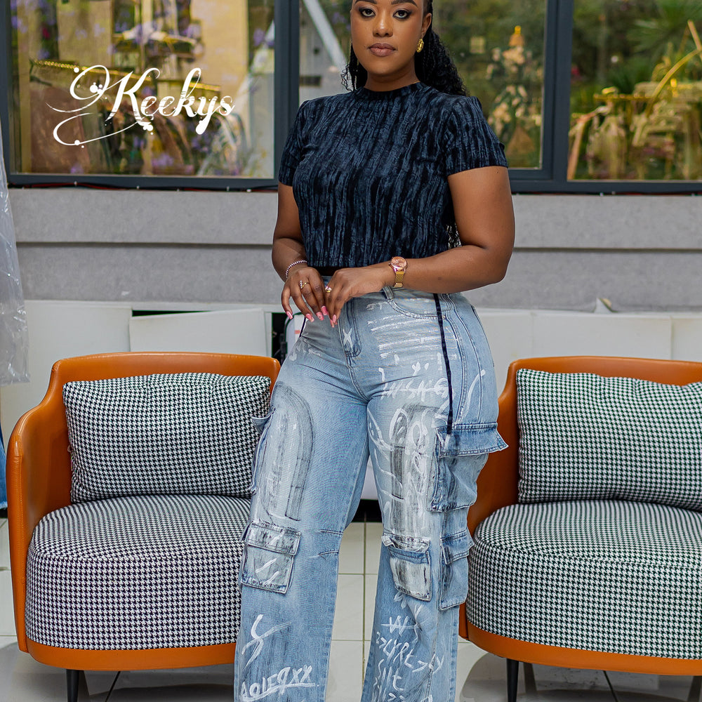 Funny letter printed cargo jeans in a beautiful light shade of blue.